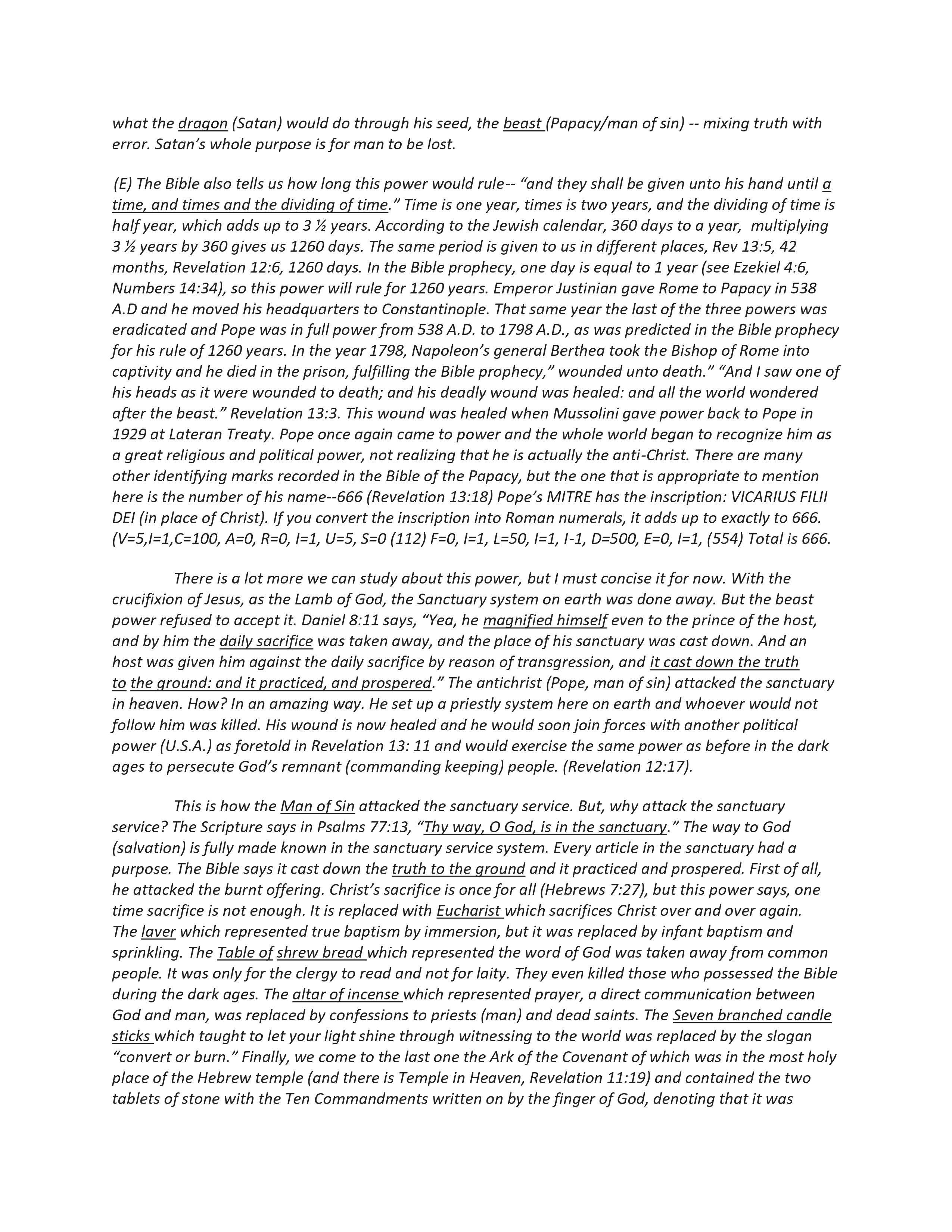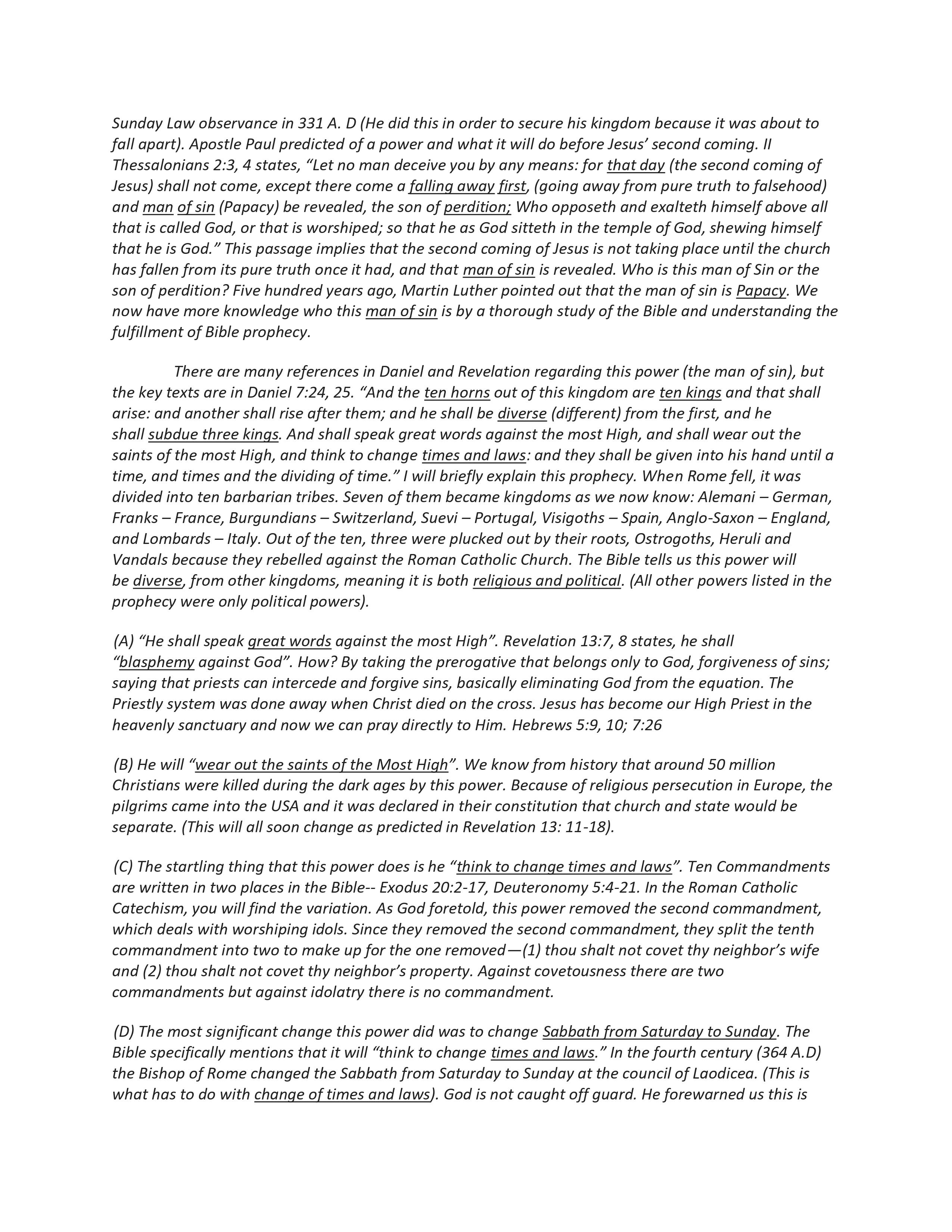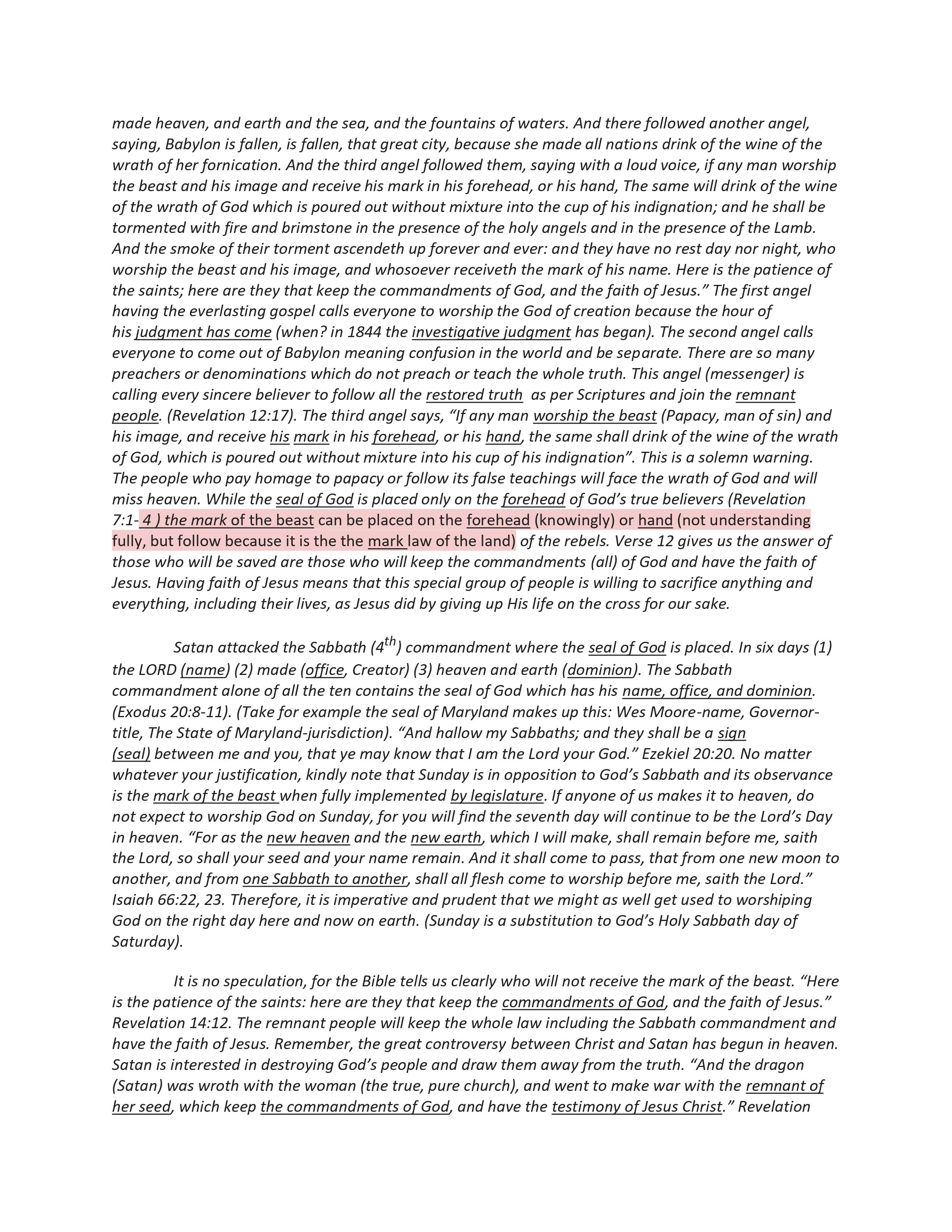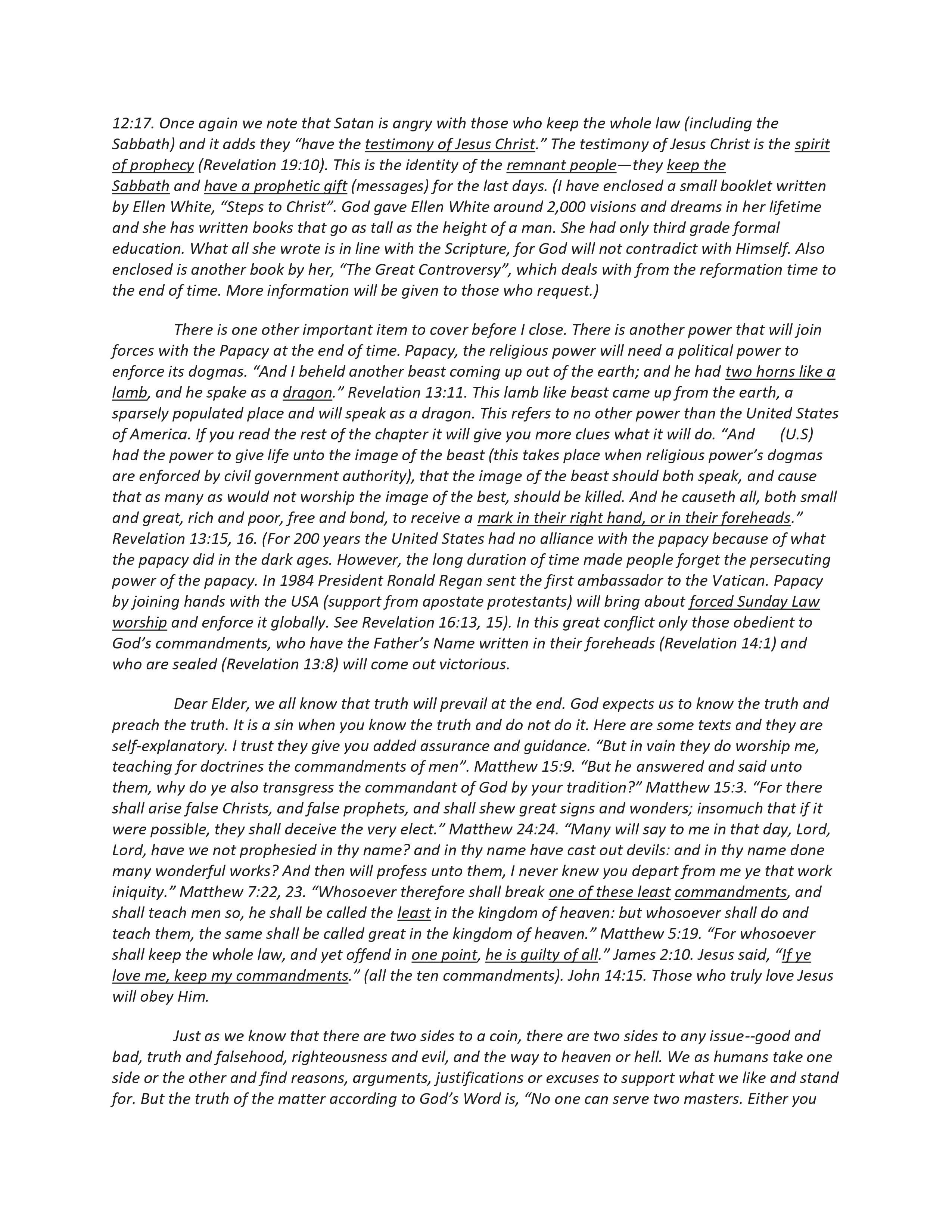 The last message to the world calls all people to worship the Creator of the universe because the judgment hour has begun (in 1844); to come out and be separate from all false teaching preachers and churches; and if any man worships the beast (Papacy) and his image, he will receive God’s wrath or punishment. We firmly believe that salvation comes only by believing in Jesus and by His saving grace and not by works. If you truly believe in Jesus, you will become like Him and do His works and keep his commandments (Eph. 2:8, 9, Rom. 6:23). The Test that you and i have is that do we truly love Jesus and keep his commandments (all). (Rev. 14:12, Rev 12:17, John 14:15).