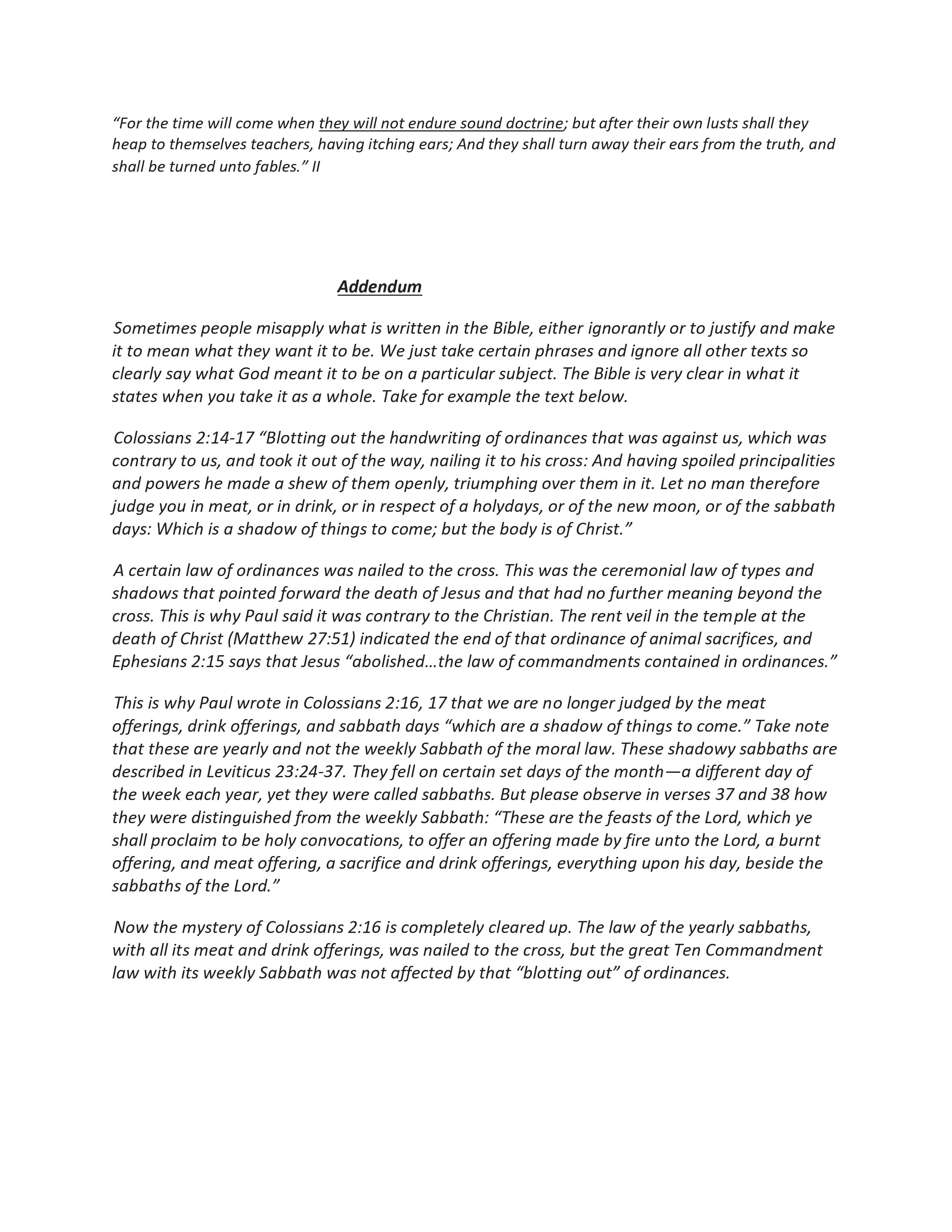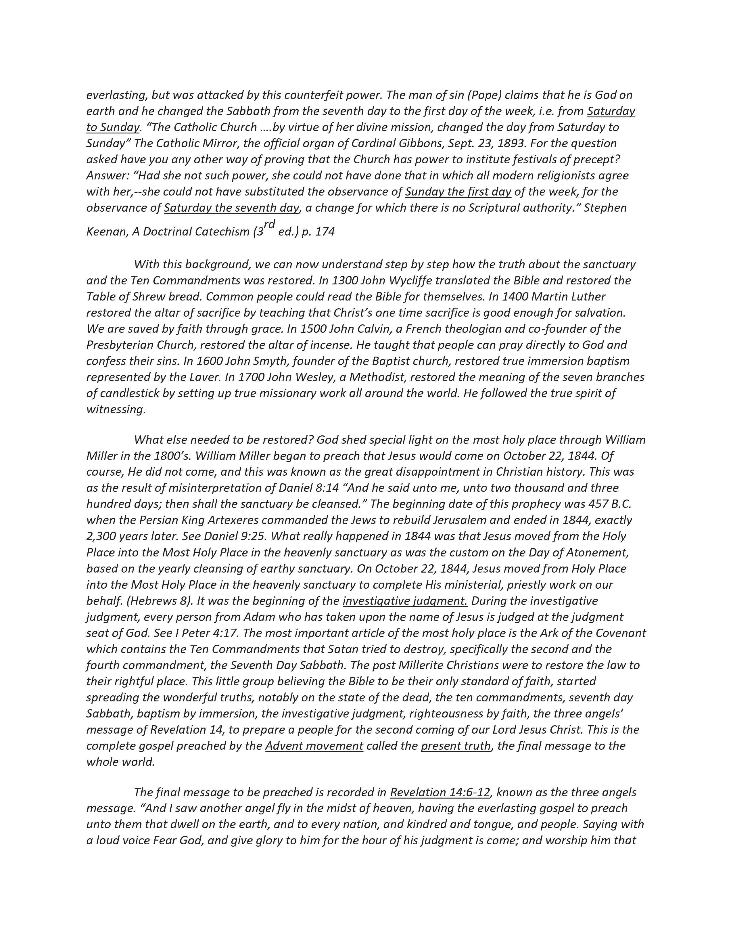 The "Truth Manifesto" deals with only two false doctrines. There are many other false teachings prevalent in the churches today. The reference book “Bible Readings”made avilable will give you further assistance to know what is the real truth on any given subject relevant to our salvation. As students of the Bible, we are all aware that there are certain warnings or special messages given to us by God for certain periods of time: To the antediluvian world, Noah’s message was “to enter into the ark and be saved”; John the Baptist message was “Repent, for the kingdom of God is at hand”; at the time of reformers, Martin Luther’s message was that the “just shall live by faith”. In the last days, the last warning message to be preached by the honest and truth filled gospel ministers (remnant people of Rev 14:12 and Rev. 12:17) is the three Angels’ message as given to us in Revelation 14:6-12. In summary.